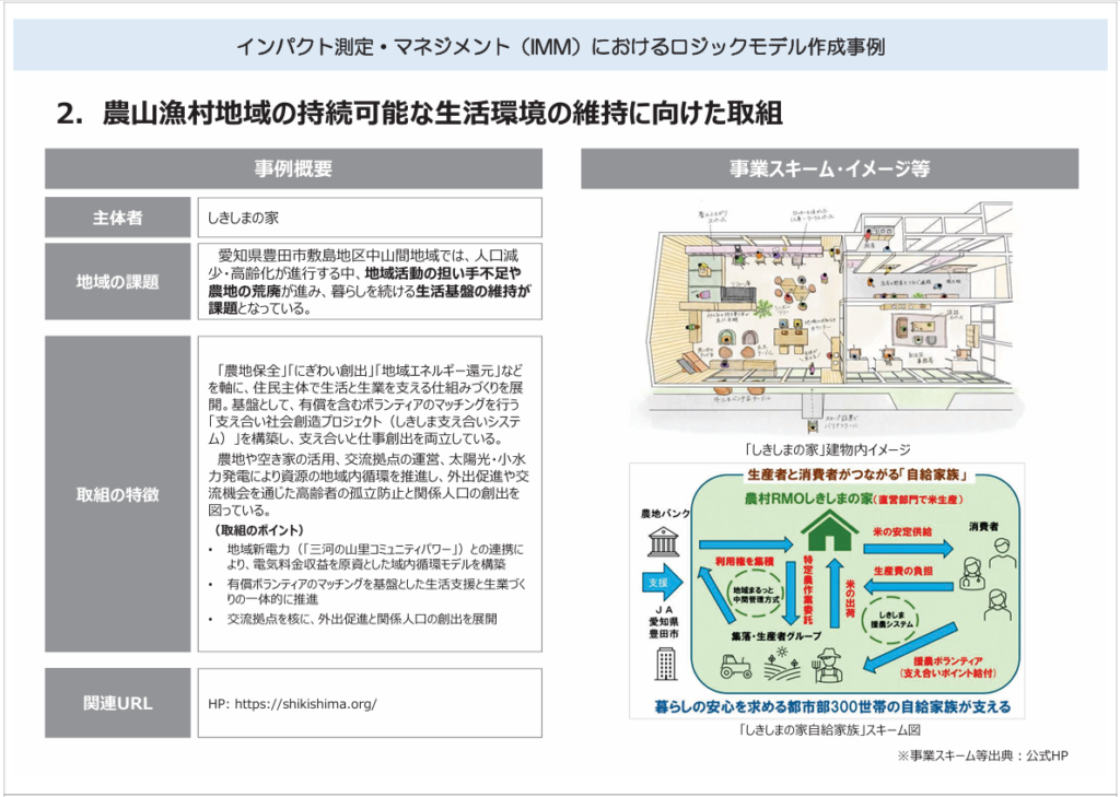 農林水産省が作成する「『農山漁村』インパクト可視化ガイダンス」に、MYパワーが関わる「しきしまの家」の取り組みが、地域に根付いた事例として紹介されましたのでお知らせします。
